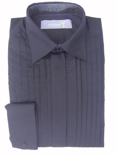 Mens Black Standard Collar Easy Care Dress Dinner Shirt. Pleated Front with a Double Cuff for Cufflinks.